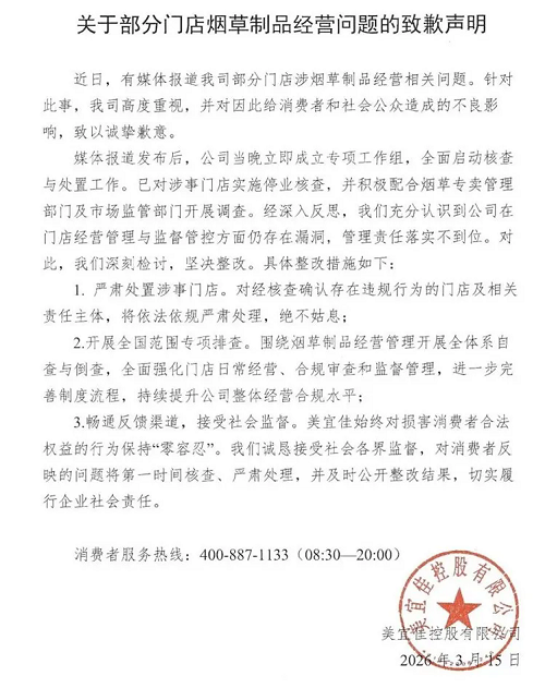 美宜佳就“多地門店被曝售賣假煙”發(fā)布致歉聲明(G)