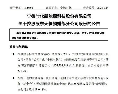 市值約20億元!寧德時代控股股東向上海交通大學捐贈500萬股股份