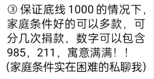另有網友發(fā)布的截圖顯示,群公告要求在“保證底線1000的情況下,家庭條件好的可多捐,可分幾次捐款,數(shù)字可包含985、211.寓意滿滿”。