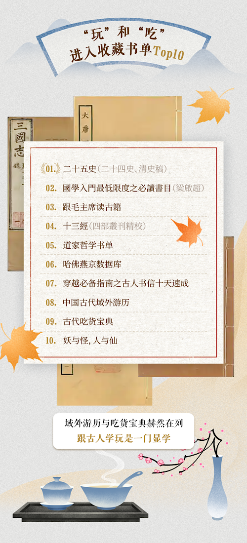 平臺支持用戶創(chuàng)建各類古籍書單,方便系統(tǒng)性閱讀。其中,“二十五史(二十四史、清史稿)”書單登頂收藏榜首位。值得關(guān)注的是,“中國古代域外游歷”“古代吃貨寶典”等聚焦游歷、美食主題的古籍書單也躋身榜單,從古籍中探尋古人“吃喝玩樂”之道成為一種熱門趨勢。