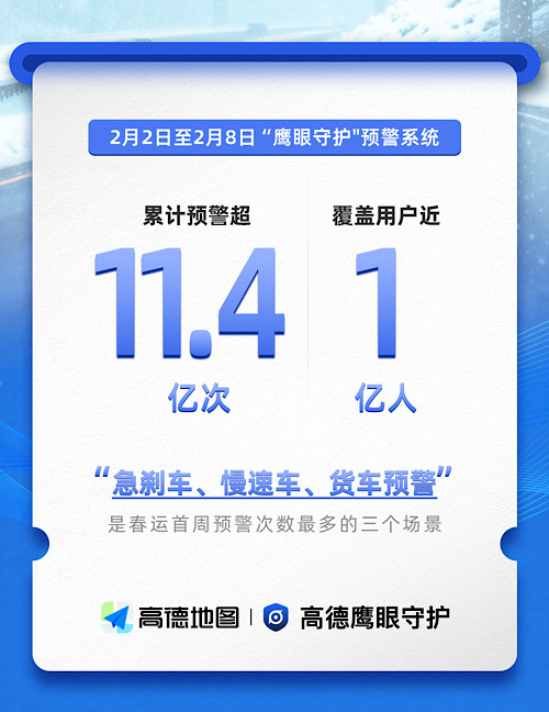 數(shù)據(jù)顯示,“鷹眼守護”在春運首周累計播發(fā)安全預(yù)警超11.4億次,覆蓋全國近1億出行用戶;春運首個高峰日(2月8日),“鷹眼守護”全天播發(fā)預(yù)警超2.2億次;其中,急剎車、慢速車、貨車預(yù)警成為首周預(yù)警次數(shù)最多的三大場景。