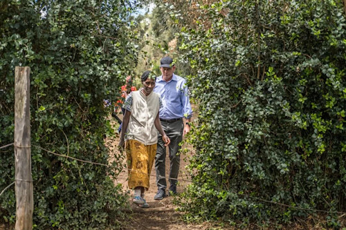 在肯尼亞,蓋茨基金會首席執(zhí)行官馬克·蘇斯曼(右)與一名當(dāng)?shù)厝俗咴诤笳叩霓r(nóng)場里