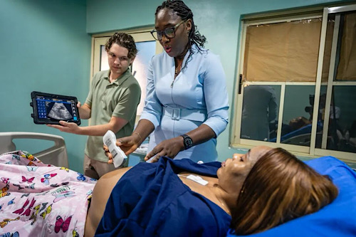 在尼日利亞,工程師正在協(xié)助婦產(chǎn)科顧問使用孕期檢測傳感器為孕婦進行檢查。這款人工智能傳感器可以實時監(jiān)測胎兒生命體征和宮縮情況