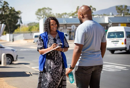 在南非,一名社區(qū)聯(lián)絡(luò)官正向來訪者介紹臨床試驗點提供的服務(wù)