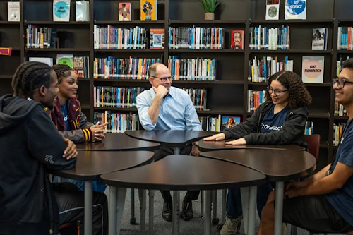 蓋茨基金會首席執(zhí)行官馬克·蘇斯曼(中)在美國休斯頓的一所高中會見學(xué)生代表