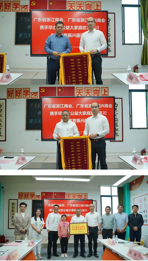會(huì)議現(xiàn)場(chǎng),廣東省民政廳機(jī)關(guān)黨委專職副書記、吳川市委副書記、廣東省“百千萬(wàn)工程”幫扶協(xié)作駐吳川市工作隊(duì)隊(duì)長(zhǎng)葉敏亮同志分別為廣東省浙江商會(huì)吳松喜會(huì)長(zhǎng)、廣東省浙江紹興商會(huì)謝永燦會(huì)長(zhǎng)、畢業(yè)后公益劉楠鑫理事長(zhǎng)頒發(fā)榮譽(yù)錦旗/牌匾