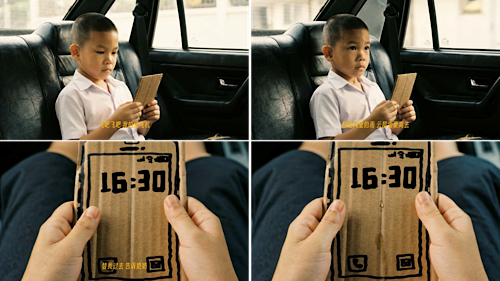 結(jié)尾長(zhǎng)達(dá)一分多鐘的車內(nèi)長(zhǎng)鏡頭,被許多人稱贊為“神來(lái)之筆”——開往福利院的車上,小男孩靜靜地捧著“紙手機(jī)”,等待永不會(huì)響起的電話,伴著AI音樂在紙板手機(jī)上落下一滴眼淚。楊選道出了創(chuàng)作邏輯:“親人的離開往往伴隨著長(zhǎng)時(shí)間的沉默,到一個(gè)時(shí)間節(jié)點(diǎn)才會(huì)流淚,這段長(zhǎng)時(shí)間的沉默,正是中國(guó)人的情感內(nèi)斂的體現(xiàn)。”