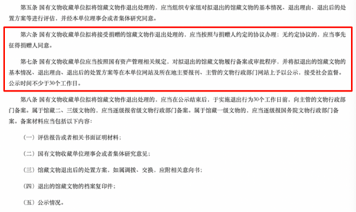 記者查詢到,2018年6月29日國家文物局公布的《國有館藏文物退出管理暫行辦法》第六條明確,國有文物收藏單位擬將接受捐贈的館藏文物作退出處理的,應(yīng)當(dāng)按照與捐贈人約定的協(xié)議辦理;無約定協(xié)議的,應(yīng)當(dāng)事先征得捐贈人同意。