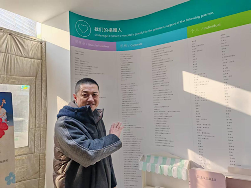 嫣然天使兒童醫(yī)院一樓,李亞鵬在“我們的捐贈(zèng)人”墻下介紹醫(yī)院的誕生歷程(趙明鑫/攝)