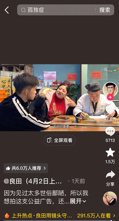 4月2日,字節(jié)跳動公益聯(lián)合抖音精選創(chuàng)作階梯計劃與創(chuàng)作者@嚶武羅、@麻湯vlog等一起開展公益倡導,產(chǎn)出多條爆款公益視頻;聯(lián)合抖音電商、抖音生活服務,攜手良田、交個朋友直播間、蔡磊破冰驛站、金龜子等主播及公益商家為孤獨癥人士開展愛心好物專場直播,使大齡孤獨癥群體走進公眾視野。在字節(jié)跳動公益平臺相關負責人看來,從線上倡導到社會融合,探索出一條可持續(xù)、可復制、規(guī)?;闹С煮w系,是當下各方應及時回應的重要議題。