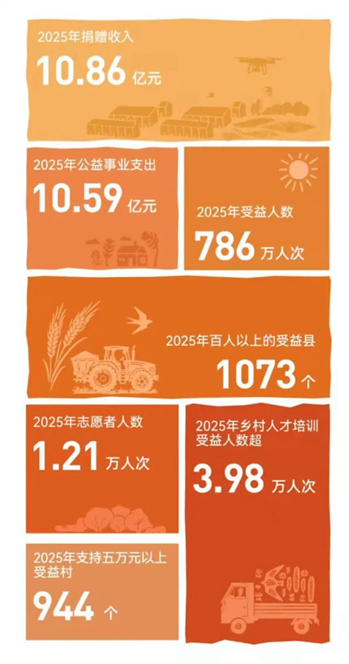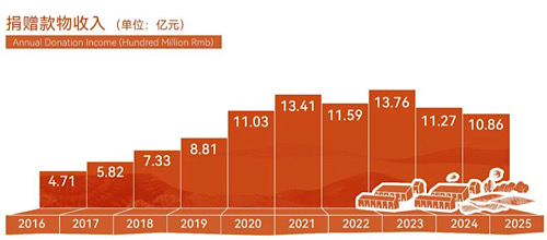 最新年報(bào)顯示,鄉(xiāng)基會(huì)2025年共接收捐贈(zèng)款物10.86億元,公益事業(yè)支出10.59億元,均較上一年略有下降。