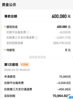 記者在平臺(tái)注意到,籌款人郝女士已將籌款總額600080元,分三次全部提現(xiàn)完畢。記錄顯示,打款均由平臺(tái)向郝女士個(gè)人賬戶打款。
