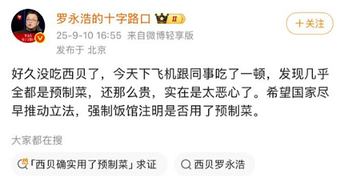 9月10日,羅永浩在微博公開吐槽連鎖餐飲品牌西貝:“幾乎全是預(yù)制菜,還那么貴”。次日,西貝創(chuàng)始人賈國(guó)龍用三個(gè)“一定”回應(yīng):“我們一定會(huì)起訴他,一定一定會(huì)起訴他!”相關(guān)話題隨即沖上熱搜。