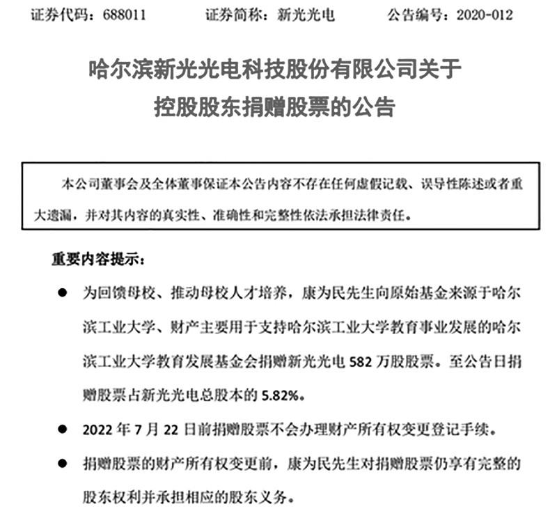 近年來股權(quán)捐贈已成為企業(yè)家/企業(yè)支持慈善事業(yè)的共同選擇和未來趨勢。而由于經(jīng)濟波動等不確定性影響因素增多,有關(guān)捐贈承諾兌現(xiàn)和落地執(zhí)行情況也備受社會關(guān)注,由此引發(fā)的爭議一直未斷。 ■ 本報記者 皮磊 據(jù)多家媒體報道,哈爾濱新光光電科技股份有限公司(簡稱“新光光電”)日前發(fā)布公告稱,公司近日收到嵩縣監(jiān)察委員會簽發(fā)的關(guān)于對公司控股股東、實際控制人、董事長、總經(jīng)理康為民的《立案通知書》和《留置通知書》,康為民被實施留置措施。 針對上述情況,有媒體致電新光光電證券部嘗試了解更多細節(jié)。該公司工作人員回應稱,“目前尚未獲得更多確切消息?!惫ぷ魅藛T表示,公司內(nèi)控完善,已召開臨時董事會落實工作安排,主營業(yè)務與產(chǎn)品方向未變。 作為一家軍工電子信息企業(yè),該消息一經(jīng)發(fā)布即引發(fā)外界猜測。不過,在關(guān)注事件進展的同時,有關(guān)康為民曾向其母校哈爾濱工業(yè)大學捐贈582萬股股票一事被翻出,甚至對該筆捐贈的程序和動機提出質(zhì)疑。事實上,近年來股權(quán)捐贈已成為企業(yè)家/企業(yè)支持慈善事業(yè)的共同選擇和未來趨勢。而由于經(jīng)濟波動等不確定性影響因素增多,有關(guān)捐贈承諾兌現(xiàn)和落地執(zhí)行情況也備受社會關(guān)注,由此引發(fā)的爭議一直未斷。 582萬股股權(quán)捐贈始末 據(jù)新光光電官網(wǎng)介紹,新光光電成立于2007年11月,注冊資本1億元,是東北地區(qū)科創(chuàng)板上市公司。該公司是一家將像方掃描成像制導技術(shù)、多光學波段合成技術(shù)等先進光電技術(shù)應用于光學制導類武器研制的企業(yè),致力于服務國防科技工業(yè)先進武器系統(tǒng)研制等領(lǐng)域。公開資料顯示,康為民父子都是哈工大人,康為民本科和碩士都在哈工大就讀,隨后又在哈工大工作20多年,直到創(chuàng)辦上市公司。 2020年6月2日,新光光電發(fā)布關(guān)于控股股東捐贈股票的公告。公告稱,公司于2020年6月1日接到控股股東康為民通知,其與哈爾濱工業(yè)大學教育發(fā)展基金會簽署了《捐贈協(xié)議書》。根據(jù)公告,為回饋母校、推動母校人才培養(yǎng),康為民向哈爾濱工業(yè)大學教育發(fā)展基金會捐贈新光光電582萬股股票。至公告日,捐贈股票占新光光電總股本的5.82%。按照當時股價計算,這批股票價值高達2.4億元。 按照捐贈協(xié)議,該筆捐贈用于設(shè)立“松高·卓越工程師獎助學金”、設(shè)立“松高·優(yōu)秀中青年教師貢獻獎”、設(shè)立“松高·優(yōu)秀科技成果獎”、設(shè)立“新興產(chǎn)業(yè)與技術(shù)發(fā)展創(chuàng)新基金”等。 2024年11月4日,新光光電發(fā)布關(guān)于控股股東捐贈股份完成過戶暨股東權(quán)益變動的提示性公告。公告稱,公司于2024年11月4日收到康為民通知,康為民與基金會的非交易過戶已經(jīng)在中國證券登記結(jié)算有限公司上海分公司完成過戶登記手續(xù),并出具了《證券過戶登記確認書》。 公告顯示,本次股份捐贈過戶登記完成后,康為民及其一致行動人持有公司股份52348457股,占公司總股本的52.35%,仍為公司控股股東。本次股份捐贈過戶登記完成后,哈爾濱工業(yè)大學教育發(fā)展基金會持有公司無限售流通股582萬股,占當時公司總股本的5.82%。 該公告還特別指出,本次股份捐贈未違反《上市公司收購管理辦法》《上市公司股東、董監(jiān)高減持股份的若干規(guī)定》《上海證券交易所上市公司股東及董事、監(jiān)事、高級管理人員減持股份實施細則》《上海證券交易所科創(chuàng)板上市公司自律監(jiān)管指南》等有關(guān)法律、法規(guī)、部門規(guī)章及規(guī)范性文件和《公司章程》的規(guī)定,也不存在相關(guān)股東因本次股份轉(zhuǎn)讓而違反尚在履行的承諾的情形。 記者查詢哈爾濱工業(yè)大學教育發(fā)展基金會2024年度工作報告發(fā)現(xiàn),2024年度基金會收到捐贈人康為民的非現(xiàn)金捐贈,合計金額為108950400元,捐贈用途為“助力學??蒲心芰ㄔO(shè)”。 股權(quán)捐贈已成趨勢 梳理近年來的大額捐贈案例發(fā)現(xiàn),股權(quán)捐贈已成為部分企業(yè)家/企業(yè)支持慈善事業(yè)的首要選項: 2025年 7月 10日晚,寧德時代發(fā)布關(guān)于股東無償捐贈部分公司股份的進展公告。公告稱,公司股東及副董事長李平及其配偶擬向上海復旦大學教育發(fā)展基金會捐贈其持有的公司405萬股股票,上述股票均為無限售流通股。7月10日,捐贈過戶手續(xù)已全部辦理完畢。按最新收盤價計算,該筆捐贈價值超11億元; 7月3日,北京龍軟科技股份有限公司發(fā)布控股股東無償捐贈部分公司股份的公告:控股股東毛善君向北京大學教育基金會無償捐贈其持有公司的250萬股無限售條件流通股,占公司總股本的3.43%。根據(jù)公告,此次捐贈資產(chǎn)用于全面支持北京大學地球與空間科學學院的發(fā)展建設(shè)。以龍軟科技當時股價(30.90元/股)估算,上述捐贈股份市值約為7725萬元; 2023年12月4日,迎駕貢酒發(fā)布公告稱,控股股東安徽迎駕集團股份有限公司擬向安徽六安市迎駕慈善基金會無償捐贈其持有的公司1950萬股無限售條件流通股,占公司總股本的2.44%。12月8日,迎駕貢酒發(fā)