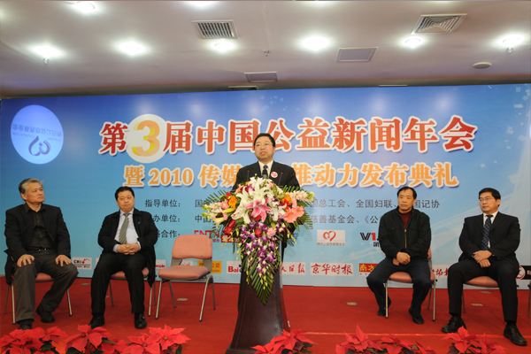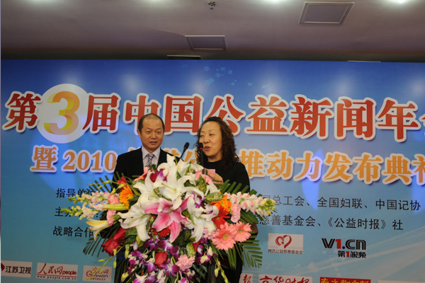 2月25日,第三屆中國(guó)公益新聞年會(huì)暨2010傳媒公益推動(dòng)力發(fā)布典禮在京召開(kāi)。全國(guó)人大原副委員長(zhǎng)、中國(guó)關(guān)心下一代工作委員會(huì)主任顧秀蓮,民政部原副部長(zhǎng)、中國(guó)社會(huì)工作協(xié)會(huì)會(huì)長(zhǎng)徐瑞新,中華全國(guó)新聞工作者協(xié)會(huì)書(shū)記處書(shū)記顧勇華等領(lǐng)導(dǎo)出席年會(huì)。