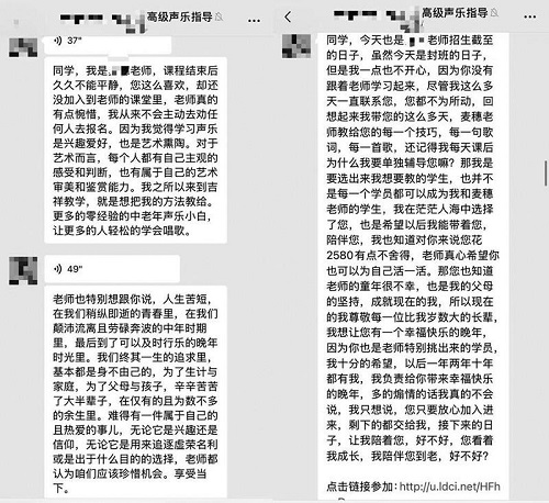 2025年5月,大學(xué)生秋秋(化名)的奶奶刷到某直播間,主播聲稱“9.9元賣書送免費(fèi)聲樂課”。秋秋替奶奶下單后,助理老師添加微信將她拉入課程群。上了線上體驗(yàn)課后,老師開始不斷私信發(fā)長(zhǎng)語(yǔ)音,慫恿購(gòu)買高價(jià)課,并打出“知道您舍不得2580元,但我想讓您有一個(gè)幸??鞓返耐砟?rdquo;等“親情牌”話術(shù)。