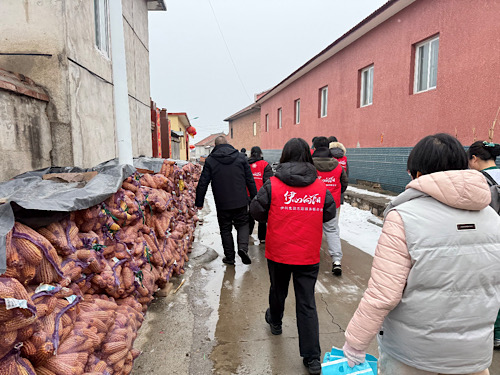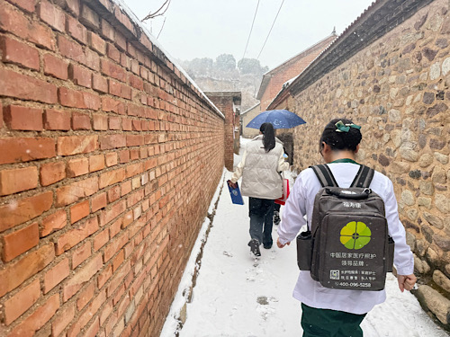 此次回訪不僅是物資的送達,更是一次照護知識的傳遞。志愿團隊由企業(yè)志愿者、福壽康集團的護理員以及本地志愿者和醫(yī)護人員共同組成。盡管天降大雪、道路濕滑,“注意安全”成為途中最高頻的叮囑,但志愿者們仍分成小組,冒雪入戶。志愿者們不僅搬運物資,還與老人促膝長談,進行心靈陪伴。