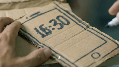 更典型的例子,是短片里唯一沒用AI創(chuàng)作的道具——手繪紙片手機(jī)。楊選與李婷認(rèn)為,AI生成結(jié)果太精致、太“絲滑”,不符合片中老板的年邁人設(shè)。最后,他們將真實(shí)道具的照片喂給AI——那個(gè)帶著深深折痕、笨拙筆跡的紙板手機(jī),藏著市井老人親手制作的粗糙質(zhì)感與真切溫度,成為全片最為重要的情感錨點(diǎn)。