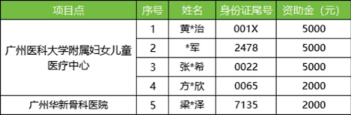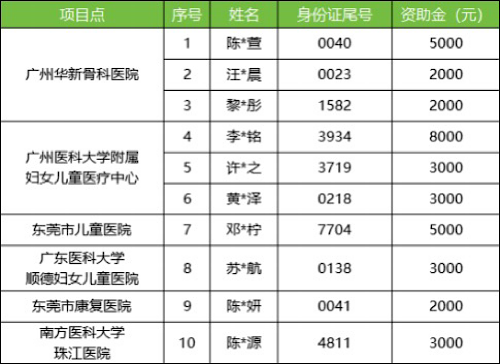另一條信息是廣州市婦女兒童醫(yī)療中心(第八批次)、南方醫(yī)科大學(xué)珠江醫(yī)院(第六批次)、廣州華新骨科醫(yī)院(第十一批次)、廣東醫(yī)科大學(xué)順德婦女兒童醫(yī)療中心(第六批次)、東莞市兒童醫(yī)院(第九批次)、東莞市康復(fù)醫(yī)院(第四批次)擬資助名單中共有10名兒童獲得“慢慢成長星計(jì)劃”專項(xiàng)基金支持,現(xiàn)對(duì)正式資助名單進(jìn)行公示: