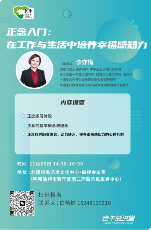 11月20日(周三)下午,第33期老牛益講堂將在呼和浩特市北疆印象藝術(shù)文化中心(四樓會議室)舉辦,主題為“正念入門:在工作與生活中培養(yǎng)幸福感知力”。