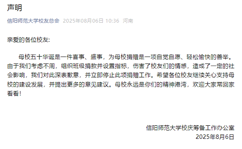 8月6日,信陽師范大學校慶籌備工作辦公室發(fā)布聲明,就此前“千班萬元”捐贈倡議致歉。聲明稱:“母校五十華誕是一件喜事、盛事,為母校捐贈是一項自覺自愿、輕松愉快的善舉。由于考慮不周,組織班級捐款并設置指標,傷害了校友們的情感,造成了一定的社會影響,對此深表歉意,并立即停止此項捐贈工作。希望各位校友繼續(xù)關心支持母校的建設發(fā)展,并提出更多的意見建議。”