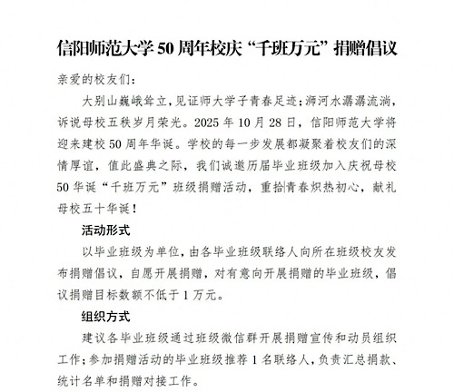 信陽師范大學發(fā)布的捐贈倡議寫到,“學校的每一步發(fā)展都凝聚著校友們的深情厚誼,值此盛典之際,我們誠邀歷屆畢業(yè)班級加入慶祝母校50華誕‘千班萬元’班級捐贈活動,重拾青春熾熱初心,獻禮母校五十華誕。”