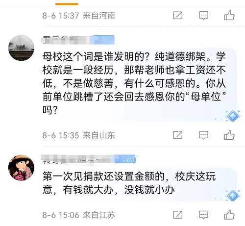 還有網(wǎng)友表示,“母校這個詞是誰發(fā)明的?純道德綁架。”