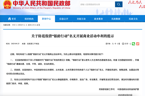 民政部發(fā)布防范假借“銀齡行動”名義牟利的提示