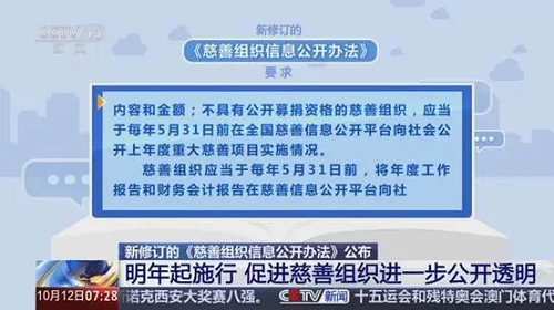 《辦法》還對公開的時間節(jié)點作出了詳細(xì)規(guī)定:年報、財報須在每年5月31日前公開;突發(fā)事件募捐階段,每5天更新一次善款信息;項目終止后,三個月內(nèi)披露剩余財產(chǎn)處理;慈善信托須每年至少公開一次……
