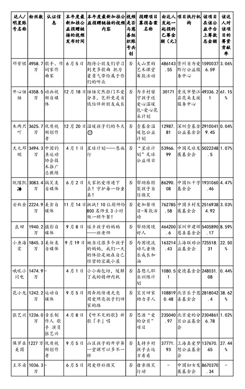 實(shí)際上,短視頻平臺(tái)上頭部達(dá)人助力公益項(xiàng)目籌資的情況不在少數(shù),公益時(shí)報(bào)可持續(xù)發(fā)展研究院對(duì)本年度發(fā)生的、熱度較高的抖音平臺(tái)千萬(wàn)以上粉絲達(dá)人或明星賬號(hào)助力公益籌款合作的數(shù)據(jù)進(jìn)行了不完全統(tǒng)計(jì)。