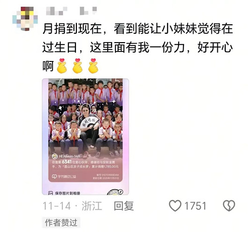 在安秋金的評(píng)論區(qū)里,一位粉絲曬出一張分享圖:“你是第6341位愛心伙伴,感謝你與安秋金攜手,為‘圓山區(qū)孩子成長(zhǎng)夢(mèng)’累計(jì)捐贈(zèng)1785元。”他評(píng)論道,月捐到現(xiàn)在,看到能讓小妹妹覺得在這里過(guò)生日很開心,這里面有我一份力。