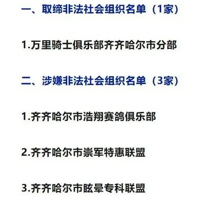 黑龍江省齊齊哈爾市民政局日前發(fā)布關(guān)于集中公布2025年第三批取締、涉嫌非法社會組織名單的通告。其中取締一家——萬里騎士俱樂部齊齊哈爾市分部;涉嫌非法社會組織三家——齊齊哈爾市浩翔賽鴿俱樂部、齊齊哈爾市崇軍特惠聯(lián)盟、齊齊哈爾市眩暈??坡?lián)盟。