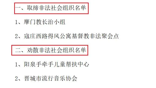 據(jù)山西省民政廳10月14日消息,山西省民政廳日前公布了一批依法取締和勸散的非法社會組織名單,其中取締兩家,包括摩門教長治小組、寇莊西路得風(fēng)公寓基督教非法聚會點(diǎn);勸散兩家,包括陽泉手牽手兒童幫扶中心、晉城市流行音樂協(xié)會。
