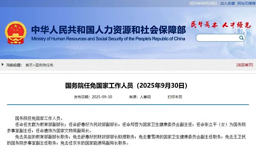 任命任友群為教育部副部長(zhǎng);任命舒惠好為民政部副部長(zhǎng);任命鄭哲為國(guó)家衛(wèi)生健康委員會(huì)副主任;任命張立平(女)為國(guó)務(wù)院參事室副主任;任命唐煒為國(guó)家文物局副局長(zhǎng)。